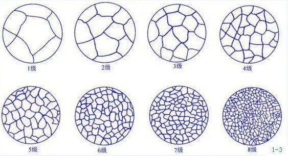 由圖1可知,晶粒度級(jí)別越大,實(shí)際晶粒就越小。其中1-3一般被認(rèn)為是粗晶粒,4-6號(hào)為中等晶粒,7-8號(hào)為細(xì)晶粒。